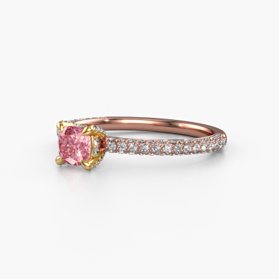 The ring shown above is called the Saskia 2 cus. We call this type of ring a pavé solitaire ring because it has one centre gemstone and a band that is also pave set with gemstones. The 14 Carat rose gold engagement ring is set with a cushion 4.5 mm pink lab grown diamond centre stone and the band is pave set with lab grown diamond gemstones. Each jewel is made just for you, with attention to detail and design.This contemporary rose gold pavé solitaire engagement ring has an exquisite cushion pink lab grown diamond centre stone. To further accentuate the centre stone, the band is fully set with more lab-grown diamonds. Its open prong setting allows light to strike the pink lab grown diamond from various angles and this adds sparkle to your pink lab grown diamond ring. The photo shown above depicts the goldsmith's carefully handcrafted details of the ring. The high positioning of the centre stone is truly eye-catching. The perfect engagement ring for the crown jewel of your life! Are you on a budget? Please feel free to contact us, so we can go discuss your options. We offer our engagement rings at guaranteed best price, because we make them to order. You won't find such a price anywhere else!Our designers and goldsmiths work together each day, creating new jewels. Perhaps you have found a nice contemporary engagement ring somewhere, which can be used to customize your unique ring. Please feel free to contact us. We will make you an offer, based on a fair price/ quality ratio, which will amaze you.To make it easier for you, we offer a 30 day return policy. Check our terms and conditions.