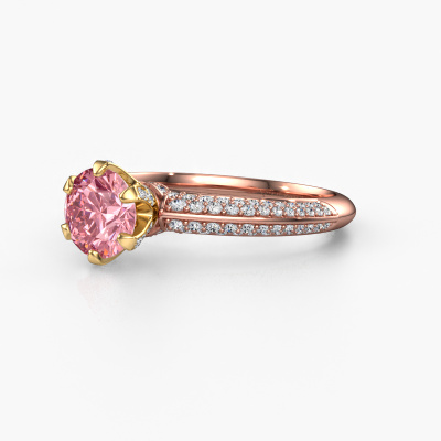 The ring shown above is called the Abby. We call this type of ring a pavé solitaire ring because it has one centre gemstone and a band that is also pave set with gemstones. The 14 Carat rose gold engagement ring is set with a round 6.5 mm pink lab grown diamond centre stone and the band is pave set with diamond gemstones. Each jewel is made just for you by our master goldsmiths in our own studio.This exclusive rose gold pavé solitaire engagement ring has an exquisite round pink lab grown diamond centre stone. To further accentuate the centre stone, the band is fully set with more diamonds. Its open prong setting allows light to strike the pink lab grown diamond from various angles and this adds sparkle to your pink lab grown diamond ring. The photo shown above depicts the goldsmith's carefully handcrafted details of the ring. The high positioning of the centre stone is truly eye-catching. The perfect engagement ring for the crown jewel of your life! Are you on a budget? Please feel free to contact us, so we can go discuss your options. We offer our engagement rings at guaranteed best price, because we make them to order. You won't find such a price anywhere else!Our team adds new designs to our online collection daily. Our designers and goldsmiths work together in creating the best design. We strive to offer a diverse collection of jewels. Perhaps you have a specific jewel design in mind. One you came across somewhere. Please contact us for a free consultation. We will make you an offer, based on a fair price/ quality ratio, that will baffle you.To make it easier for you, we offer a 30 day return policy. Check our terms and conditions.