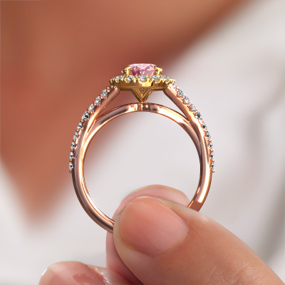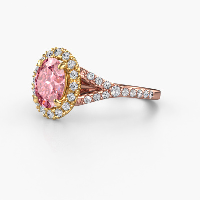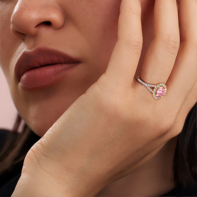 The ring shown above is called the Kimber OVL. We call this type of ring a pavé solitaire ring because it has one centre gemstone and a band that is also pave set with gemstones. The 14 Carat rose gold engagement ring is set with a oval 8x6 mm pink lab grown diamond centre stone and the band is pave set with lab grown diamond gemstones. Each jewel is made with passion and love by one of our master goldsmiths.This exclusive rose gold pavé solitaire engagement ring has an exquisite oval pink lab grown diamond centre stone. To further accentuate the centre stone, the band is fully set with more lab-grown diamonds. Its open prong setting allows light to strike the pink lab grown diamond from various angles and this adds sparkle to your pink lab grown diamond ring. The photo shown above depicts the goldsmith's carefully handcrafted details of the ring. The high positioning of the centre stone is truly eye-catching. The perfect engagement ring for the crown jewel of your life! By using a combination of the latest modern techniques, combined with ancient crafting, we can make all our engagement rings in our own studio. Each jewel is made to order. This is advantageous because we can offer you a price you won't find anywhere else.Our team adds new designs to our online collection daily. Our designers and goldsmiths work together in creating the best design. We strive to offer a diverse collection of jewels. Perhaps you have a specific jewel design in mind. One you came across somewhere. Please contact us for a free consultation. We will make you an offer, based on a fair price/ quality ratio, that will baffle you.To make it easier for you, we offer a 30 day return policy. Check our terms and conditions.