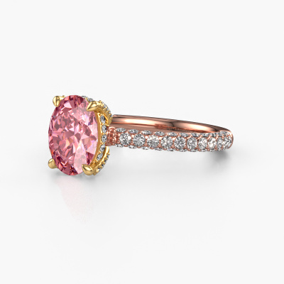 The ring shown above is called the Saskia 2 ovl. We call this type of ring a pavé solitaire ring because it has one centre gemstone and a band that is also pave set with gemstones. The 14 Carat rose gold engagement ring is set with a oval 9x7 mm pink lab grown diamond centre stone and the band is pave set with lab grown diamond gemstones. Each jewel is made just for you by our master goldsmiths in our own studio.This exclusive rose gold pavé solitaire engagement ring has an exquisite oval pink lab grown diamond centre stone. To further accentuate the centre stone, the band is fully set with more lab-grown diamonds. Its open prong setting allows light to strike the pink lab grown diamond from various angles and this adds sparkle to your pink lab grown diamond ring. The photo shown above depicts the goldsmith's carefully handcrafted details of the ring. The high positioning of the centre stone is truly eye-catching. The perfect engagement ring for the crown jewel of your life! After receiving your order, our goldsmiths will passionately start the creative process of making your engagement ring in our own studio. Because we don't have a big stockpile, these costs will not be passed on to you. Our pricing is proof of that! We offer top quality jewels at lowest price, guaranteed.Have you found a specific engagement ring somewhere which you would like to give to your loved one? Please feel free to express your wishes to our jewel designers because we would be honoured to turn your design into a exclusive engagement ring. You can follow the development of your ring design because we use 3D drawings. This gives you a realistic preview of how your design will look. You can also preorder a dummy. A dummy is a plastic ring, which can be shaped according your ring design. You can try it on and check if its width and size are suitable for you. We will gladly send you a non-binding offer, based on a fair price/ quality ratio. It will amaze you, considering the quality of the ring and gemstones.To make it easier for you, we offer a 30 day return policy. Check our terms and conditions.