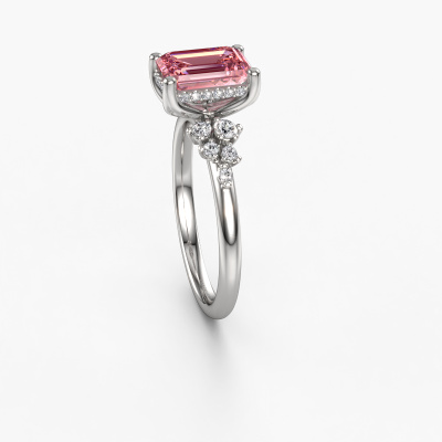The ring shown above is called the Emma EME. We call this type of ring a pavé solitaire ring because it has one centre gemstone and a band that is also pave set with gemstones. This engagement ring is made in 14 Carat white gold set with a 8x6 mm emerald cut pink lab grown diamond, and pave set lab-grown diamonds at the sides. Each piece of jewellery is made with passion and love by one of our master goldsmiths.This fantasy white gold pavé solitaire engagement ring has an exquisite emerald cut pink lab grown diamond centre stone. To further accentuate the centre stone, the band is set full with more lab-grown diamonds. Its open prong setting allows light to strike the pink lab grown diamond from various angles and this adds sparkle to your pink lab grown diamond ring. The photo shown above depicts the goldsmith's carefully handcrafted details of the ring. The high positioning of the centre stone is truly eye-catching. The perfect engagement ring for the crown jewel of your life!After receiving your order, our goldsmiths will passionately start the creative process of making your engagement ring in our own studio. Because we don't have a big stockpile, these costs will not be passed on to you. Our pricing is proof of that! We offer top quality jewels at lowest price, guaranteed.Our team adds new designs to our online collection daily. Our designers and goldsmiths work together in creating the best design. We strive to offer a diverse collection of jewels. Perhaps you have a specific jewel design in mind. One you came across somewhere. Please contact us for a free consultation. We will make you an offer, based on a fair price/ quality ratio, that will baffle you.To make it easier for you, we offer a 30 day return policy. Check our terms and conditions.