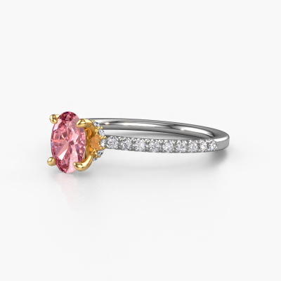 The ring shown above is called the Crystal OVL 4. We call this type of ring a pavé solitaire ring because it has one centre gemstone and a band that is also pave set with gemstones. The 14 Carat white gold engagement ring is set with a oval 7x5 mm pink lab grown diamond centre stone and the band is pave set with diamond gemstones. Each jewel is made with passion and love by one of our master goldsmiths.This contemporary white gold pavé solitaire engagement ring has an exquisite oval pink lab grown diamond centre stone. To further accentuate the centre stone, the band is fully set with more diamonds. Its open prong setting allows light to strike the pink lab grown diamond from various angles and this adds sparkle to your pink lab grown diamond ring. The photo shown above depicts the goldsmith's carefully handcrafted details of the ring. The high positioning of the centre stone is truly eye-catching. The perfect engagement ring for the crown jewel of your life! After receiving your order, our goldsmiths will passionately start the creative process of making your engagement ring in our own studio. Because we don't have a big stockpile, these costs will not be passed on to you. Our pricing is proof of that! We offer top quality jewels at lowest price, guaranteed.Our team adds new designs to our online collection daily. Our designers and goldsmiths work together in creating the best design. We strive to offer a diverse collection of jewels. Perhaps you have a specific jewel design in mind. One you came across somewhere. Please contact us for a free consultation. We will make you an offer, based on a fair price/ quality ratio, that will baffle you.To make it easier for you, we offer a 30 day return policy. Check our terms and conditions.