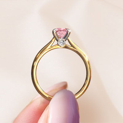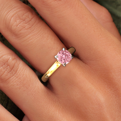 The ring shown above is called the Valorie cus 1, we call this a solitaire ring because it contains a single gemstone. The engagement ring is made in 14 Carat gold and has a cushion pink lab grown diamond of 6 mm. The cool thing about our configurator is that you can compile your own piece of jewellery, into a completely personalized one. This solitaire ring is crafted in the precious metals gold with white gold, but of course you are free to pick your own colours. Each piece of jewellery is made to shine bright around your finger. Each jewel is hand made with love by our goldsmiths.The solitaire ring is a special type of engagement ring. Its open prong setting allows light to strike the gemstone from various angles. This classic engagement ring is a stunning eye-catcher because of the high positioning of the gemstone. In order for you to commemorate your proposal with a unique ring, we carefully adorn this solitaire ring by hand. The love of your life deserves nothing but the best. Are you on a budget? Please feel free to contact us, so we can go discuss your options. We offer our engagement rings at guaranteed best price, because we make them to order. You won't find such a price anywhere else!Have you found a specific engagement ring somewhere which you would like to give to your loved one? Please feel free to express your wishes to our jewel designers because we would be honoured to turn your design into a classic engagement ring. You can follow the development of your ring design because we use 3D drawings. This gives you a realistic preview of how your design will look. You can also preorder a dummy. A dummy is a plastic ring, which can be shaped according your ring design. You can try it on and check if its width and size are suitable for you. We will gladly send you a non-binding offer, based on a fair price/ quality ratio. It will amaze you, considering the quality of the ring and gemstones.To make it easier for you, we offer a 30 day return policy. Check our terms and conditions.