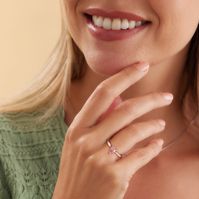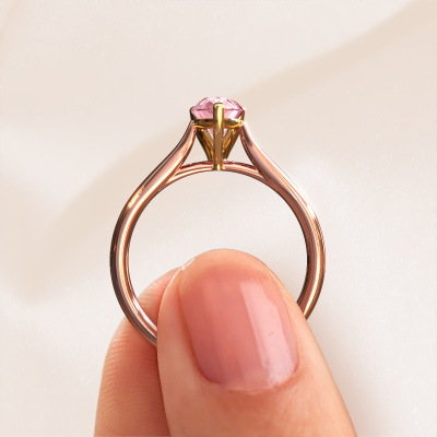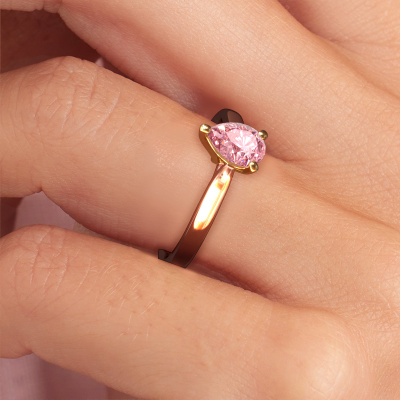 The ring shown above is called the Mignon PER 1, we call this a solitaire ring because it contains a single gemstone. The engagement ring is made in 14 Carat rose gold and has a pear pink lab grown diamond of 7x5 mm. The cool thing about our configurator is that you can compile your own piece of jewellery, into a completely personalized one. This solitaire ring is crafted in the precious metals rose gold with gold, but of course you are free to pick your own colours. Each piece of jewellery is created to add sparkle to your finger, each jewel is lovingly made by hand by our goldsmiths.The solitaire ring is a special type of engagement ring. Its open prong setting allows light to strike the gemstone from various angles. This classic engagement ring is a stunning eye-catcher because of the high positioning of the gemstone. In order for you to commemorate your proposal with a unique ring, we carefully adorn this solitaire ring by hand. The love of your life deserves nothing but the best. After receiving your order, our goldsmiths will start the creative process of making your Mignon PER 1 engagement ring. We don't keep stock. This is advantageous because these costs will not be passed on to you. Therefore, we can offer jewellery at exceptionally low prices.Our team adds new designs to our online collection daily. Our designers and goldsmiths work together in creating the best design. We strive to offer a diverse collection of jewels. Perhaps you have a specific jewel design in mind. One you came across somewhere. Please contact us for a free consultation. We will make you an offer, based on a fair price/ quality ratio, that will baffle you.To make it easier for you, we offer a 30 day return policy. Check our terms and conditions.