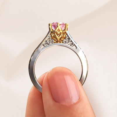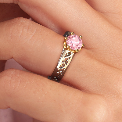 The ring shown above is called the Shan, we call this a solitaire ring because it contains a single gemstone. The engagement ring is made in 14 Carat white gold and has a round pink lab grown diamond of 6 mm. The cool thing about our configurator is that you can compile your own piece of jewellery, into a completely personalized one. This solitaire ring is crafted in the precious metals white gold with gold, but of course you are free to pick your own colours. Each piece of jewellery is made by a team of passionate goldsmiths and jewel designers. This will make your crown jewel truly eye-catching.The solitaire ring is a special type of engagement ring. Its open prong setting allows light to strike the gemstone from various angles. This Celtic engagement ring is a stunning eye-catcher because of the high positioning of the gemstone. In order for you to commemorate your proposal with a unique ring, we carefully adorn this solitaire ring by hand. The love of your life deserves nothing but the best. By using our modern techniques, we can design and customize the finest quality jewels with the utmost care for you. Our engagement rings are always priced 30 percent lower than other jewellers. We make engagement rings to order so we don't have to maintain a large stock. If you have a certain budget, we are more than happy to advice you accordingly.Have you found a specific engagement ring somewhere which you would like to give to your loved one? Please feel free to express your wishes to our jewel designers because we would be honoured to turn your design into a Celtic engagement ring. You can follow the development of your ring design because we use 3D drawings. This gives you a realistic preview of how your design will look. You can also preorder a dummy. A dummy is a plastic ring, which can be shaped according your ring design. You can try it on and check if its width and size are suitable for you. We will gladly send you a non-binding offer, based on a fair price/ quality ratio. It will amaze you, considering the quality of the ring and gemstones.To make it easier for you, we offer a 30 day return policy. Check our terms and conditions.