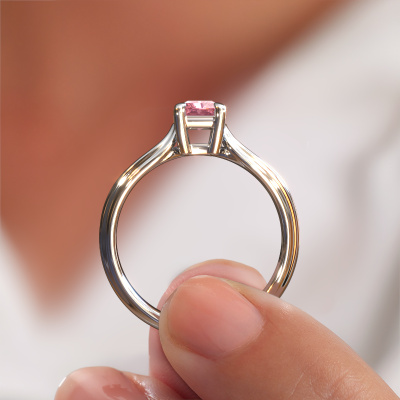 This platinum ring is called Antonia rad 1 and is set with pink lab grown diamond. How would you describe the style of the love of your life? Does she have a unique sense of style? This stunning split band platinum engagement ring can be custom-made to your own or her liking. Our pink lab grown diamonds gemstones have been carefully selected because we believe your fantasy engagement ring must be adorned with nothing but the most beautiful gemstone. Don't you agree? This jewel is made with passion and love by one of our master goldsmiths.Are you on a budget? Please feel free to contact us, so we can go discuss your options. We offer our engagement rings at guaranteed best price, because we make them to order. You won't find such a price anywhere else!Our team adds new designs to our online collection daily. Our designers and goldsmiths work together in creating the best design. We strive to offer a diverse collection of jewels. Perhaps you have a specific jewel design in mind. One you came across somewhere. Please contact us for a free consultation. We will make you an offer, based on a fair price/ quality ratio, that will baffle you.To make it easier for you, we offer a 30 day return policy. Check our terms and conditions.