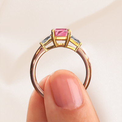 This 14 Carat rose gold ring is called Kina EME and is set with pink sapphire. How would you describe the style of the love of your life? Does she have a unique sense of style? This stunning special rose gold engagement ring can be custom-made to your own or her liking. Our pink sapphire gemstones have been carefully selected because we believe your exclusive engagement ring must be adorned with nothing but the most beautiful gemstone. Don't you agree? This jewel is made by a team of passionate goldsmiths and jewel designers. This will make your crown jewel truly eye-catching.Are you on a budget? Please feel free to contact us, so we can go discuss your options. We offer our engagement rings at guaranteed best price, because we make them to order. You won't find such a price anywhere else!Have you found a specific engagement ring somewhere which you would like to give to your loved one? Please feel free to express your wishes to our jewel designers because we would be honoured to turn your design into a exclusive engagement ring. You can follow the development of your ring design because we use 3D drawings. This gives you a realistic preview of how your design will look. You can also preorder a dummy. A dummy is a plastic ring, which can be shaped according your ring design. You can try it on and check if its width and size are suitable for you. We will gladly send you a non-binding offer, based on a fair price/ quality ratio. It will amaze you, considering the quality of the ring and gemstones.To make it easier for you, we offer a 30 day return policy. Check our terms and conditions.