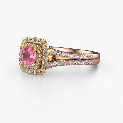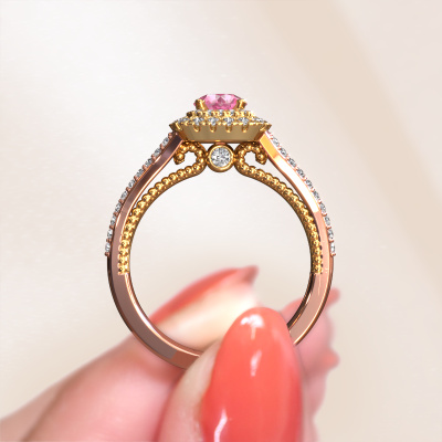 The ring shown above is called the Annette. We call this type of ring a halo ring because it has one centre gemstone and a band that is also pave set with gemstones. The 14 Carat rose gold engagement ring is set with a round 5 mm pink sapphire centre stone and the band is pave set with diamond gemstones. Each jewel is made just for you by our master goldsmiths in our own studio.This vintage rose gold halo engagement ring has an exquisite round pink sapphire centre stone. To further accentuate the centre stone, the band is fully set with more diamonds. Its open prong setting allows light to strike the pink sapphire from various angles and this adds sparkle to your pink sapphire ring. The photo shown above depicts the goldsmith's carefully handcrafted details of the ring. The high positioning of the centre stone is truly eye-catching. The perfect engagement ring for the crown jewel of your life! After receiving your order, our goldsmiths will passionately start the creative process of making your engagement ring in our own studio. Because we don't have a big stockpile, these costs will not be passed on to you. Our pricing is proof of that! We offer top quality jewels at lowest price, guaranteed.Have you found a specific engagement ring somewhere which you would like to give to your loved one? Please feel free to express your wishes to our jewel designers because we would be honoured to turn your design into a vintage engagement ring. You can follow the development of your ring design because we use 3D drawings. This gives you a realistic preview of how your design will look. You can also preorder a dummy. A dummy is a plastic ring, which can be shaped according your ring design. You can try it on and check if its width and size are suitable for you. We will gladly send you a non-binding offer, based on a fair price/ quality ratio. It will amaze you, considering the quality of the ring and gemstones.To make it easier for you, we offer a 30 day return policy. Check our terms and conditions.