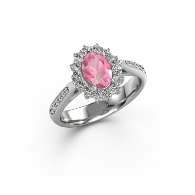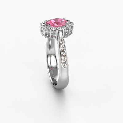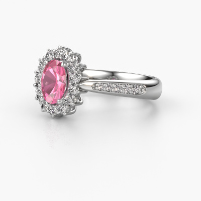 The ring shown above is called the Margien 2. We call this a Lady Diana ring. With an Lady Diana engagement ring, the larger centre gem is encircled by smaller side stones. This 14 Carat white gold ring is set with a 7x5 mm oval pink sapphire gemstone, surrounded by smaller diamonds side stones. It's the most famous and celebrated engagement ring in the world; The Lady Diana ring. Exclusively meant for the most remarkable person in your life! A truly stunning aspect of this Lady Diana ring is its centre pink sapphire. The smaller side stones embracing the pink sapphire emphasize the sparkle of the centre gemstone, this makes it look as though they merge into one big gemstone. Due to its design, this is even more apparent in the Lady Di ring. Our expert Goldsmiths are keen to create a unique ring just for you. We can even customize the ring to your liking in our own crafting studio. This piece of jewellery is created to add sparkle to your finger, each jewel is lovingly made by hand by our goldsmiths.Are you on a budget? Please feel free to contact us, so we can go discuss your options. We offer our engagement rings at guaranteed best price, because we make them to order. You won't find such a price anywhere else!Our team adds new designs to our online collection daily. Our designers and goldsmiths work together in creating the best design. We strive to offer a diverse collection of jewels. Perhaps you have a specific jewel design in mind. One you came across somewhere. Please contact us for a free consultation. We will make you an offer, based on a fair price/ quality ratio, that will baffle you.To make it easier for you, we offer a 30 day return policy. Check our terms and conditions.
