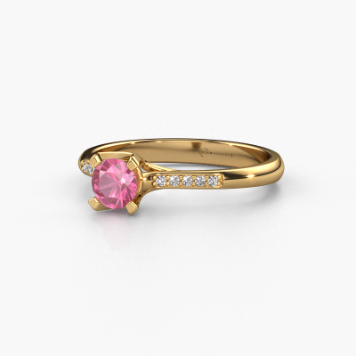 The ring shown above is called the Isa 2. We call this type of ring a pavé solitaire ring because it has one centre gemstone and a band that is also pave set with gemstones. This engagement ring is made in 14 Carat gold set with a 4.2 mm round pink sapphire, and pave set diamonds at the sides. Each piece of jewellery is created to add sparkle to your finger, each jewel is lovingly made by hand by our goldsmiths.This classic gold pavé solitaire engagement ring has an exquisite round pink sapphire centre stone. To further accentuate the centre stone, the band is set full with more diamonds. Its open prong setting allows light to strike the pink sapphire from various angles and this adds sparkle to your pink sapphire ring. The photo shown above depicts the goldsmith's carefully handcrafted details of the ring. The high positioning of the centre stone is truly eye-catching. The perfect engagement ring for the crown jewel of your life!After receiving your order, our goldsmiths will passionately start the creative process of making your engagement ring in our own studio. Because we don't have a big stockpile, these costs will not be passed on to you. Our pricing is proof of that! We offer top quality jewels at lowest price, guaranteed.Different styles of new rings are made daily by our team. Perhaps you have found a pavé solitaire engagement ring somewhere. One you would like to give to your loved one. Please feel free to share your thoughts and design with our jewel designers. We would love to turn your design into a classic engagement ring. You can follow the development of your ring design because we use very detailed 3D drawings. On top of that, you can order a dummy of the design. A dummy is a plastic ring, which can be shaped according your ring design. You can try it on and check if the engagement ring is up to standard. We will gladly send you a non-binding offer, based on a fair price/ quality ratio. The offer will baffle you, considering the quality of the ring and gemstones.To make it easier for you, we offer a 30 day return policy. Check our terms and conditions.