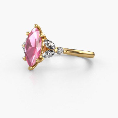 The ring shown above is called the Megan MRQ. We call this type of ring a pavé solitaire ring because it has one centre gemstone and a band that is also pave set with gemstones. This engagement ring is made in 14 Carat gold set with a 11x5.5 mm marquise pink sapphire, and pave set lab-grown diamonds at the sides. Each piece of jewellery is made with passion and love by one of our master goldsmiths.This fantasy gold pavé solitaire engagement ring has an exquisite marquise pink sapphire centre stone. To further accentuate the centre stone, the band is set full with more lab-grown diamonds. Its open prong setting allows light to strike the pink sapphire from various angles and this adds sparkle to your pink sapphire ring. The photo shown above depicts the goldsmith's carefully handcrafted details of the ring. The high positioning of the centre stone is truly eye-catching. The perfect engagement ring for the crown jewel of your life![bestp1v_long]Have you found a specific engagement ring somewhere which you would like to give to your loved one? Please feel free to express your wishes to our jewel designers because we would be honoured to turn your design into a fantasy engagement ring. You can follow the development of your ring design because we use 3D drawings. This gives you a realistic preview of how your design will look. You can also preorder a dummy. A dummy is a plastic ring, which can be shaped according your ring design. You can try it on and check if its width and size are suitable for you. We will gladly send you a non-binding offer, based on a fair price/ quality ratio. It will amaze you, considering the quality of the ring and gemstones.To make it easier for you, we offer a 30 day return policy. Check our terms and conditions.