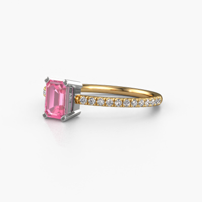 The ring shown above is called the Denita 2 EME. We call this type of ring a pavé solitaire ring because it has one centre gemstone and a band that is also pave set with gemstones. This engagement ring is made in 14 Carat gold set with a 6x4 mm emerald cut pink sapphire, and pave set diamonds at the sides. Each piece of jewellery is made just for you by our master goldsmiths in our own studio.This traditional gold pavé solitaire engagement ring has an exquisite emerald cut pink sapphire centre stone. To further accentuate the centre stone, the band is set full with more diamonds. Its open prong setting allows light to strike the pink sapphire from various angles and this adds sparkle to your pink sapphire ring. The photo shown above depicts the goldsmith's carefully handcrafted details of the ring. The high positioning of the centre stone is truly eye-catching. The perfect engagement ring for the crown jewel of your life!Are you on a budget? Please feel free to contact us, so we can go discuss your options. We offer our engagement rings at guaranteed best price, because we make them to order. You won't find such a price anywhere else!Our team adds new designs to our online collection daily. Our designers and goldsmiths work together in creating the best design. We strive to offer a diverse collection of jewels. Perhaps you have a specific jewel design in mind. One you came across somewhere. Please contact us for a free consultation. We will make you an offer, based on a fair price/ quality ratio, that will baffle you.To make it easier for you, we offer a 30 day return policy. Check our terms and conditions.