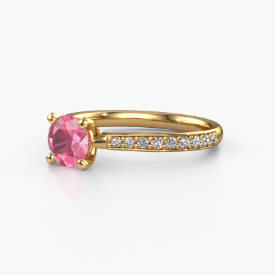 The ring shown above is called the Mignon rnd 2. We call this type of ring a pavé solitaire ring because it has one centre gemstone and a band that is also pave set with gemstones. The 14 Carat gold engagement ring is set with a round 6 mm pink sapphire centre stone and the band is pave set with lab grown diamond gemstones. Each jewel is made by a team of passionate goldsmiths and jewel designers. This will make your crown jewel truly eye-catching.This luxury gold pavé solitaire engagement ring has an exquisite round pink sapphire centre stone. To further accentuate the centre stone, the band is fully set with more lab-grown diamonds. Its open prong setting allows light to strike the pink sapphire from various angles and this adds sparkle to your pink sapphire ring. The photo shown above depicts the goldsmith's carefully handcrafted details of the ring. The high positioning of the centre stone is truly eye-catching. The perfect engagement ring for the crown jewel of your life! By using our modern techniques, we can design and customize the finest quality jewels with the utmost care for you. Our engagement rings are always priced 30 percent lower than other jewellers. We make engagement rings to order so we don't have to maintain a large stock. If you have a certain budget, we are more than happy to advice you accordingly.Different styles of new rings are made daily by our team. Perhaps you have found a pavé solitaire engagement ring somewhere. One you would like to give to your loved one. Please feel free to share your thoughts and design with our jewel designers. We would love to turn your design into a luxury engagement ring. You can follow the development of your ring design because we use very detailed 3D drawings. On top of that, you can order a dummy of the design. A dummy is a plastic ring, which can be shaped according your ring design. You can try it on and check if the engagement ring is up to standard. We will gladly send you a non-binding offer, based on a fair price/ quality ratio. The offer will baffle you, considering the quality of the ring and gemstones.To make it easier for you, we offer a 30 day return policy. Check our terms and conditions.