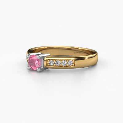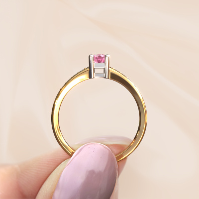 The ring shown above is called the Eline 2. We call this type of ring a pavé solitaire ring because it has one centre gemstone and a band that is also pave set with gemstones. The 14 Carat gold engagement ring is set with a round 3.7 mm pink sapphire centre stone and the band is pave set with diamond gemstones. Each jewel is unique in every way! Simply customize to your liking,This modern gold pavé solitaire engagement ring has an exquisite round pink sapphire centre stone. To further accentuate the centre stone, the band is fully set with more diamonds. Its open prong setting allows light to strike the pink sapphire from various angles and this adds sparkle to your pink sapphire ring. The photo shown above depicts the goldsmith's carefully handcrafted details of the ring. The high positioning of the centre stone is truly eye-catching. The perfect engagement ring for the crown jewel of your life! Because we design and deliver our own rings, we can offer you a engagement ring at a price you won't find anywhere else. A ring is made to order, which helps prevent excess supplies, so we can make you a great price offer. We understand it feels risky, buying your engagement ring online, but we will gladly assist in the designing process, taking your budget into consideration.Our team adds new designs to our online collection daily. Our designers and goldsmiths work together in creating the best design. We strive to offer a diverse collection of jewels. Perhaps you have a specific jewel design in mind. One you came across somewhere. Please contact us for a free consultation. We will make you an offer, based on a fair price/ quality ratio, that will baffle you.To make it easier for you, we offer a 30 day return policy. Check our terms and conditions.