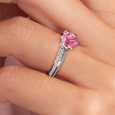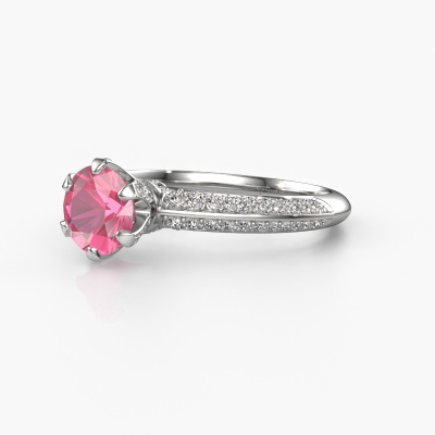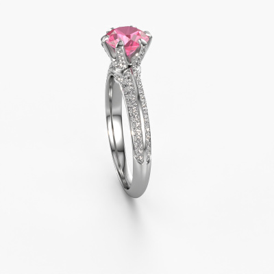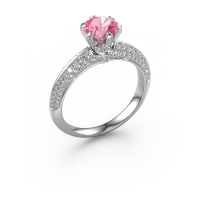 The ring shown above is called the Abby. We call this type of ring a pavé solitaire ring because it has one centre gemstone and a band that is also pave set with gemstones. The platinum engagement ring is set with a round 6.5 mm pink sapphire centre stone and the band is pave set with diamond gemstones. Each jewel is made just for you by our master goldsmiths in our own studio.This exclusive platinum pavé solitaire engagement ring has an exquisite round pink sapphire centre stone. To further accentuate the centre stone, the band is fully set with more diamonds. Its open prong setting allows light to strike the pink sapphire from various angles and this adds sparkle to your pink sapphire ring. The photo shown above depicts the goldsmith's carefully handcrafted details of the ring. The high positioning of the centre stone is truly eye-catching. The perfect engagement ring for the crown jewel of your life! Are you on a budget? Please feel free to contact us, so we can go discuss your options. We offer our engagement rings at guaranteed best price, because we make them to order. You won't find such a price anywhere else!Our team adds new designs to our online collection daily. Our designers and goldsmiths work together in creating the best design. We strive to offer a diverse collection of jewels. Perhaps you have a specific jewel design in mind. One you came across somewhere. Please contact us for a free consultation. We will make you an offer, based on a fair price/ quality ratio, that will baffle you.To make it easier for you, we offer a 30 day return policy. Check our terms and conditions.