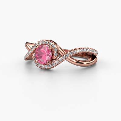 The ring shown above is called the Melody. We call this type of ring a pavé solitaire ring because it has one centre gemstone and a band that is also pave set with gemstones. This engagement ring is made in 14 Carat rose gold set with a 5 mm round pink sapphire, and pave set diamonds at the sides. Each piece of jewellery is unique in every way! Simply customize to your likingThis classic rose gold pavé solitaire engagement ring has an exquisite round pink sapphire centre stone. To further accentuate the centre stone, the band is set full with more diamonds. Its open prong setting allows light to strike the pink sapphire from various angles and this adds sparkle to your pink sapphire ring. The photo shown above depicts the goldsmith's carefully handcrafted details of the ring. The high positioning of the centre stone is truly eye-catching. The perfect engagement ring for the crown jewel of your life!Because we design and deliver our own rings, we can offer you a engagement ring at a price you won't find anywhere else. A ring is made to order, which helps prevent excess supplies, so we can make you a great price offer. We understand it feels risky, buying your engagement ring online, but we will gladly assist in the designing process, taking your budget into consideration.Do you have a specific ring in mind? One you came across somewhere. Please feel free to tell us your wishes and we will turn your design into a unique engagement ring. You can follow the development of your ring design because we use 3D drawings. This gives you a realistic preview of your design. We will gladly send you a non-binding offer, based on a fair price/ quality ratio. It will amaze you.To make it easier for you, we offer a 30 day return policy. Check our terms and conditions.