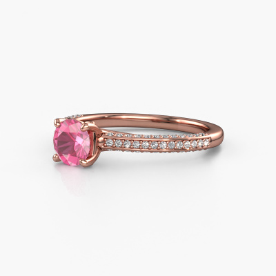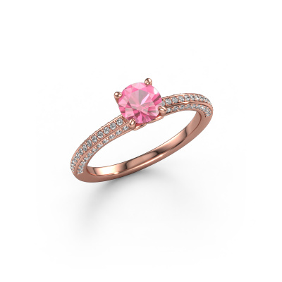 The ring shown above is called the Elenore rnd. We call this type of ring a pavé solitaire ring because it has one centre gemstone and a band that is also pave set with gemstones. This engagement ring is made in 14 Carat rose gold set with a 5.4 mm round pink sapphire, and pave set lab-grown diamonds at the sides. Each piece of jewellery is made just for you by our master goldsmiths in our own studio.This exclusive rose gold pavé solitaire engagement ring has an exquisite round pink sapphire centre stone. To further accentuate the centre stone, the band is set full with more lab-grown diamonds. Its open prong setting allows light to strike the pink sapphire from various angles and this adds sparkle to your pink sapphire ring. The photo shown above depicts the goldsmith's carefully handcrafted details of the ring. The high positioning of the centre stone is truly eye-catching. The perfect engagement ring for the crown jewel of your life!By using a combination of the latest modern techniques, combined with ancient crafting, we can make all our engagement rings in our own studio. Each jewel is made to order. This is advantageous because we can offer you a price you won't find anywhere else.Have you found a specific engagement ring somewhere which you would like to give to your loved one? Please feel free to express your wishes to our jewel designers because we would be honoured to turn your design into a exclusive engagement ring. You can follow the development of your ring design because we use 3D drawings. This gives you a realistic preview of how your design will look. You can also preorder a dummy. A dummy is a plastic ring, which can be shaped according your ring design. You can try it on and check if its width and size are suitable for you. We will gladly send you a non-binding offer, based on a fair price/ quality ratio. It will amaze you, considering the quality of the ring and gemstones.To make it easier for you, we offer a 30 day return policy. Check our terms and conditions.