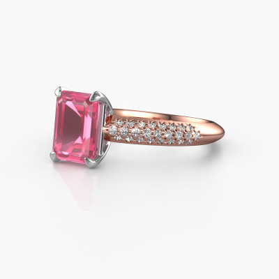 The ring shown above is called the Morane EME. We call this type of ring a pavé solitaire ring because it has one centre gemstone and a band that is also pave set with gemstones. The 14 Carat rose gold engagement ring is set with a emerald cut 8x6 mm pink sapphire centre stone and the band is pave set with lab grown diamond gemstones. Each jewel is made just for you by our master goldsmiths in our own studio.This unique rose gold pavé solitaire engagement ring has an exquisite emerald cut pink sapphire centre stone. To further accentuate the centre stone, the band is fully set with more lab-grown diamonds. Its open prong setting allows light to strike the pink sapphire from various angles and this adds sparkle to your pink sapphire ring. The photo shown above depicts the goldsmith's carefully handcrafted details of the ring. The high positioning of the centre stone is truly eye-catching. The perfect engagement ring for the crown jewel of your life! After receiving your order, our goldsmiths will passionately start the creative process of making your engagement ring in our own studio. Because we don't have a big stockpile, these costs will not be passed on to you. Our pricing is proof of that! We offer top quality jewels at lowest price, guaranteed.Our team adds new designs to our online collection daily. Our designers and goldsmiths work together in creating the best design. We strive to offer a diverse collection of jewels. Perhaps you have a specific jewel design in mind. One you came across somewhere. Please contact us for a free consultation. We will make you an offer, based on a fair price/ quality ratio, that will baffle you.To make it easier for you, we offer a 30 day return policy. Check our terms and conditions.