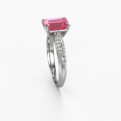 The ring shown above is called the Morane EME. We call this type of ring a pavé solitaire ring because it has one centre gemstone and a band that is also pave set with gemstones. The 14 Carat white gold engagement ring is set with a emerald cut 8x6 mm pink sapphire centre stone and the band is pave set with lab grown diamond gemstones. Each jewel is made just for you by our master goldsmiths in our own studio.This unique white gold pavé solitaire engagement ring has an exquisite emerald cut pink sapphire centre stone. To further accentuate the centre stone, the band is fully set with more lab-grown diamonds. Its open prong setting allows light to strike the pink sapphire from various angles and this adds sparkle to your pink sapphire ring. The photo shown above depicts the goldsmith's carefully handcrafted details of the ring. The high positioning of the centre stone is truly eye-catching. The perfect engagement ring for the crown jewel of your life! After receiving your order, our goldsmiths will passionately start the creative process of making your engagement ring in our own studio. Because we don't have a big stockpile, these costs will not be passed on to you. Our pricing is proof of that! We offer top quality jewels at lowest price, guaranteed.Our team adds new designs to our online collection daily. Our designers and goldsmiths work together in creating the best design. We strive to offer a diverse collection of jewels. Perhaps you have a specific jewel design in mind. One you came across somewhere. Please contact us for a free consultation. We will make you an offer, based on a fair price/ quality ratio, that will baffle you.To make it easier for you, we offer a 30 day return policy. Check our terms and conditions.