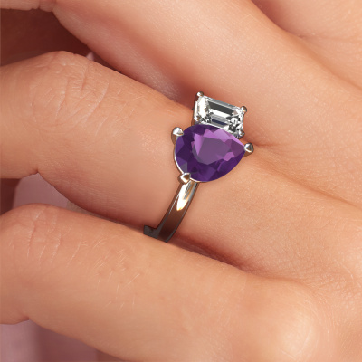 This platinum ring is called Toi et Moi PER-EME and is set with amethyst. Are you in the market for a unique platinum engagement ring with a trendy appearance? Then this ring is perfect for you. Simply customize to your or her liking. This chic sparkling engagement ring is set with exquisite amethyst. It has been carefully selected because your engagement ring must be adorned with nothing but the most beautiful gemstone. Our expert goldsmith will create your ring in our own studio where the amethyst will be set with great care. The ring will then be polished to perfection to give it that extra sparkle. The perfect ring for your significant other! By using a combination of the latest modern techniques, combined with ancient crafting, we can make all our engagement rings in our own studio. Each jewel is made to order. This is advantageous because we can offer you a price you won't find anywhere else.Our team adds new designs to our online collection daily. Our designers and goldsmiths work together in creating the best design. We strive to offer a diverse collection of jewels. Perhaps you have a specific jewel design in mind. One you came across somewhere. Please contact us for a free consultation. We will make you an offer, based on a fair price/ quality ratio, that will baffle you.To make it easier for you, we offer a 30 day return policy. Check our terms and conditions.