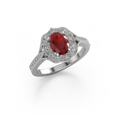 This platinum ring is called Loni and is set with 7,5x5,5 mm ruby. This filigree platinum engagement ring is a true work of art! A beautifully adorned design of intricate wires. With dedication, patience and the utmost precision, our expert goldsmith will design a ring just for you. The adornment of small wiring is crafted to perfection by hand. It's a lengthy process which includes welding, crafting and polishing until our Goldsmiths are completely satisfied with the result: a perfect eye-catching ring that makes her shine with delight. Therefore the vintage filigree engagement ring is an extraordinary gift to bestow upon the love of your life. A handmade one-of-a-kind personalized ring, to be given to that special someone on that special moment when you pop the question. Isn't that wonderful? This piece of jewellery is made with passion and love by one of our master goldsmiths.Because we design and deliver our own rings, we can offer you a engagement ring at a price you won't find anywhere else. A ring is made to order, which helps prevent excess supplies, so we can make you a great price offer. We understand it feels risky, buying your engagement ring online, but we will gladly assist in the designing process, taking your budget into consideration.Our team adds new designs to our online collection daily. Our designers and goldsmiths work together in creating the best design. We strive to offer a diverse collection of jewels. Perhaps you have a specific jewel design in mind. One you came across somewhere. Please contact us for a free consultation. We will make you an offer, based on a fair price/ quality ratio, that will baffle you.To make it easier for you, we offer a 30 day return policy. Check our terms and conditions.