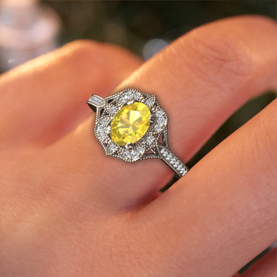 This platinum ring is called Loni and is set with 7,5x5,5 mm yellow sapphire. This filigree platinum engagement ring is a true work of art! A beautifully adorned design of intricate wires. With dedication, patience and the utmost precision, our expert goldsmith will design a ring just for you. The adornment of small wiring is crafted to perfection by hand. It's a lengthy process which includes welding, crafting and polishing until our Goldsmiths are completely satisfied with the result: a perfect eye-catching ring that makes her shine with delight. Therefore the vintage filigree engagement ring is an extraordinary gift to bestow upon the love of your life. A handmade one-of-a-kind personalized ring, to be given to that special someone on that special moment when you pop the question. Isn't that wonderful? This piece of jewellery is made with passion and love by one of our master goldsmiths.Because we design and deliver our own rings, we can offer you a engagement ring at a price you won't find anywhere else. A ring is made to order, which helps prevent excess supplies, so we can make you a great price offer. We understand it feels risky, buying your engagement ring online, but we will gladly assist in the designing process, taking your budget into consideration.Our team adds new designs to our online collection daily. Our designers and goldsmiths work together in creating the best design. We strive to offer a diverse collection of jewels. Perhaps you have a specific jewel design in mind. One you came across somewhere. Please contact us for a free consultation. We will make you an offer, based on a fair price/ quality ratio, that will baffle you.To make it easier for you, we offer a 30 day return policy. Check our terms and conditions.