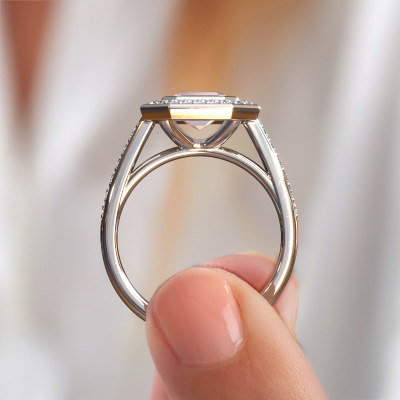 This platinum ring is called Noud 2 EME and is set with 8x6 mm morganite champagne. Does your girlfriend fancy exclusive jewellery? Or would you like to show her that she deserves the finest jewellery? This platinum ring is pure craftsmanship, love and passion combined with the latest techniques coming together in perfect harmony. It requires a keen eye, patience and a skilful hand to mould this ring into perfection. Just the job for our expert goldsmith! The morganite champagne set gemstones gives this platinum ring an extra glamorous appearance. Customize the style of the pavé engagement ring to her liking with a wide variety of precious metals and gemstones which you select. That is how you create a unique ring for the most exclusive woman in your life! This jewel is created to add sparkle to your finger, each jewel is lovingly made by hand by our goldsmiths.After receiving your order, our goldsmiths will start the creative process of making your Noud 2 EME engagement ring. We don't keep stock. This is advantageous because these costs will not be passed on to you. Therefore, we can offer jewellery at exceptionally low prices.Have you found a specific engagement ring somewhere which you would like to give to your loved one? Please feel free to express your wishes to our jewel designers because we would be honoured to turn your design into a exclusive engagement ring. You can follow the development of your ring design because we use 3D drawings. This gives you a realistic preview of how your design will look. You can also preorder a dummy. A dummy is a plastic ring, which can be shaped according your ring design. You can try it on and check if its width and size are suitable for you. We will gladly send you a non-binding offer, based on a fair price/ quality ratio. It will amaze you, considering the quality of the ring and gemstones.To make it easier for you, we offer a 30 day return policy. Check our terms and conditions.