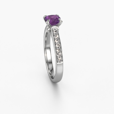 The ring shown above is called the Valorie cus 2. We call this type of ring a pavé solitaire ring because it has one centre gemstone and a band that is also pave set with gemstones. The platinum engagement ring is set with a cushion 5.5 mm amethyst centre stone and the band is pave set with diamond gemstones. Each jewel is made just for you by our master goldsmiths in our own studio.This traditional platinum pavé solitaire engagement ring has an exquisite cushion amethyst centre stone. To further accentuate the centre stone, the band is fully set with more diamonds. Its open prong setting allows light to strike the amethyst from various angles and this adds sparkle to your amethyst ring. The photo shown above depicts the goldsmith's carefully handcrafted details of the ring. The high positioning of the centre stone is truly eye-catching. The perfect engagement ring for the crown jewel of your life! By using a combination of the latest modern techniques, combined with ancient crafting, we can make all our engagement rings in our own studio. Each jewel is made to order. This is advantageous because we can offer you a price you won't find anywhere else.Our designers and goldsmiths work together each day, creating new jewels. Perhaps you have found a nice traditional engagement ring somewhere, which can be used to customize your unique ring. Please feel free to contact us. We will make you an offer, based on a fair price/ quality ratio, which will amaze you.To make it easier for you, we offer a 30 day return policy. Check our terms and conditions.