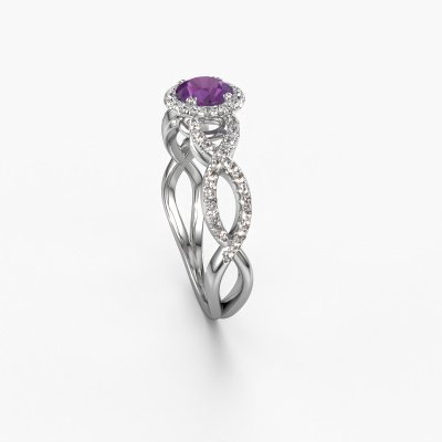 The ring shown above is called the Dionne rnd. We call this type of ring a pavé solitaire ring because it has one centre gemstone and a band that is also pave set with gemstones. The platinum engagement ring is set with a round 5 mm amethyst centre stone and the band is pave set with diamond gemstones. Each jewel is made just for you by our master goldsmiths in our own studio.This classic platinum pavé solitaire engagement ring has an exquisite round amethyst centre stone. To further accentuate the centre stone, the band is fully set with more diamonds. Its open prong setting allows light to strike the amethyst from various angles and this adds sparkle to your amethyst ring. The photo shown above depicts the goldsmith's carefully handcrafted details of the ring. The high positioning of the centre stone is truly eye-catching. The perfect engagement ring for the crown jewel of your life! Because we design and deliver our own rings, we can offer you a engagement ring at a price you won't find anywhere else. A ring is made to order, which helps prevent excess supplies, so we can make you a great price offer. We understand it feels risky, buying your engagement ring online, but we will gladly assist in the designing process, taking your budget into consideration.Do you have a specific ring in mind? One you came across somewhere. Please feel free to tell us your wishes and we will turn your design into a unique engagement ring. You can follow the development of your ring design because we use 3D drawings. This gives you a realistic preview of your design. We will gladly send you a non-binding offer, based on a fair price/ quality ratio. It will amaze you.To make it easier for you, we offer a 30 day return policy. Check our terms and conditions.