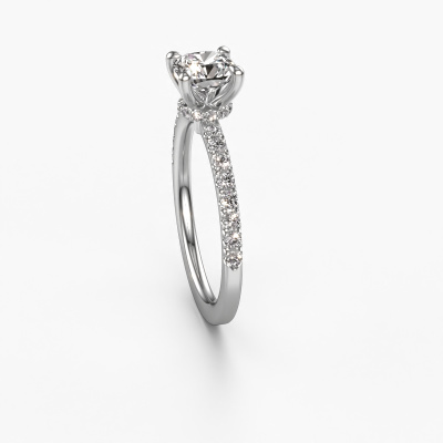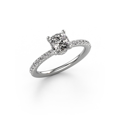 The ring shown above is called the Crystal CUS 4. We call this type of ring a pavé solitaire ring because it has one centre gemstone and a band that is also pave set with gemstones. The platinum engagement ring is set with a cushion 1.00 crt diamond centre stone and the band is pave set with diamond gemstones. Each jewel is created to add sparkle to your finger, each jewel is lovingly made by hand by our goldsmiths.This chic platinum pavé solitaire engagement ring has an exquisite cushion diamond centre stone. To further accentuate the centre stone, the band is fully set with more diamonds. Its open prong setting allows light to strike the diamond from various angles and this adds sparkle to your diamond ring. The photo shown above depicts the goldsmith's carefully handcrafted details of the ring. The high positioning of the centre stone is truly eye-catching. The perfect engagement ring for the crown jewel of your life! By using our modern techniques, we can design and customize the finest quality jewels with the utmost care for you. Our engagement rings are always priced 30 percent lower than other jewellers. We make engagement rings to order so we don't have to maintain a large stock. If you have a certain budget, we are more than happy to advice you accordingly.Do you have a specific ring in mind? One you came across somewhere. Please feel free to tell us your wishes and we will turn your design into a unique engagement ring. You can follow the development of your ring design because we use 3D drawings. This gives you a realistic preview of your design. We will gladly send you a non-binding offer, based on a fair price/ quality ratio. It will amaze you.To make it easier for you, we offer a 30 day return policy. Check our terms and conditions.