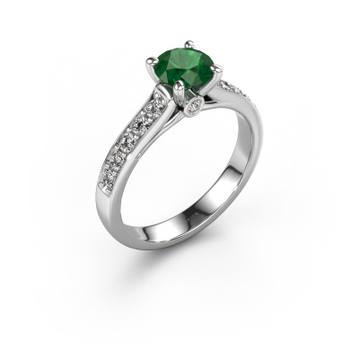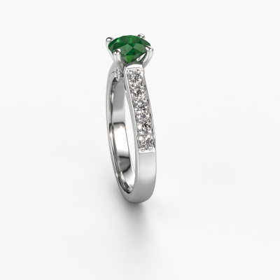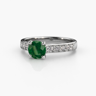 The ring shown above is called the Valorie RND 2. We call this type of ring a pavé solitaire ring because it has one centre gemstone and a band that is also pave set with gemstones. The platinum engagement ring is set with a round 6.5 mm emerald centre stone and the band is pave set with lab grown diamond gemstones. Each jewel is made just for you, with attention to detail and design.This modern platinum pavé solitaire engagement ring has an exquisite round emerald centre stone. To further accentuate the centre stone, the band is fully set with more lab-grown diamonds. Its open prong setting allows light to strike the emerald from various angles and this adds sparkle to your emerald ring. The photo shown above depicts the goldsmith's carefully handcrafted details of the ring. The high positioning of the centre stone is truly eye-catching. The perfect engagement ring for the crown jewel of your life! By using our modern techniques, we can design and customize the finest quality jewels with the utmost care for you. Our engagement rings are always priced 30 percent lower than other jewellers. We make engagement rings to order so we don't have to maintain a large stock. If you have a certain budget, we are more than happy to advice you accordingly.Our designers and goldsmiths work together each day, creating new jewels. Perhaps you have found a nice modern engagement ring somewhere, which can be used to customize your unique ring. Please feel free to contact us. We will make you an offer, based on a fair price/ quality ratio, which will amaze you.To make it easier for you, we offer a 30 day return policy. Check our terms and conditions.