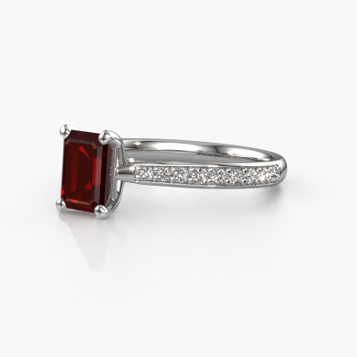 The ring shown above is called the Mignon eme 2. We call this type of ring a pavé solitaire ring because it has one centre gemstone and a band that is also pave set with gemstones. The platinum engagement ring is set with a emerald cut 7x5 mm garnet centre stone and the band is pave set with lab grown diamond gemstones. Each jewel is made just for you, with attention to detail and design.This exclusive platinum pavé solitaire engagement ring has an exquisite emerald cut garnet centre stone. To further accentuate the centre stone, the band is fully set with more lab-grown diamonds. Its open prong setting allows light to strike the garnet from various angles and this adds sparkle to your garnet ring. The photo shown above depicts the goldsmith's carefully handcrafted details of the ring. The high positioning of the centre stone is truly eye-catching. The perfect engagement ring for the crown jewel of your life! Are you on a budget? Please feel free to contact us, so we can go discuss your options. We offer our engagement rings at guaranteed best price, because we make them to order. You won't find such a price anywhere else!Do you have a specific ring in mind? One you came across somewhere. Please feel free to tell us your wishes and we will turn your design into a unique engagement ring. You can follow the development of your ring design because we use 3D drawings. This gives you a realistic preview of your design. We will gladly send you a non-binding offer, based on a fair price/ quality ratio. It will amaze you.To make it easier for you, we offer a 30 day return policy. Check our terms and conditions.