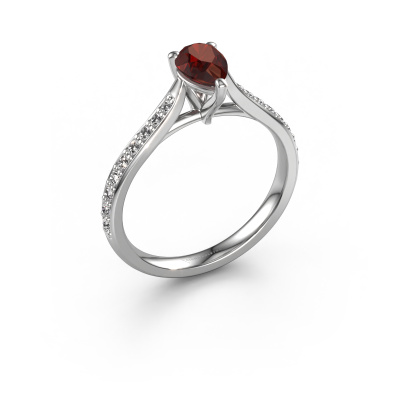 The ring shown above is called the Mignon per 2. We call this type of ring a pavé solitaire ring because it has one centre gemstone and a band that is also pave set with gemstones. The platinum engagement ring is set with a pear 6.5x4.5 mm garnet centre stone and the band is pave set with diamond gemstones. Each jewel is made just for you by our master goldsmiths in our own studio.This trendy platinum pavé solitaire engagement ring has an exquisite pear garnet centre stone. To further accentuate the centre stone, the band is fully set with more diamonds. Its open prong setting allows light to strike the garnet from various angles and this adds sparkle to your garnet ring. The photo shown above depicts the goldsmith's carefully handcrafted details of the ring. The high positioning of the centre stone is truly eye-catching. The perfect engagement ring for the crown jewel of your life! Are you on a budget? Please feel free to contact us, so we can go discuss your options. We offer our engagement rings at guaranteed best price, because we make them to order. You won't find such a price anywhere else!Our team adds new designs to our online collection daily. Our designers and goldsmiths work together in creating the best design. We strive to offer a diverse collection of jewels. Perhaps you have a specific jewel design in mind. One you came across somewhere. Please contact us for a free consultation. We will make you an offer, based on a fair price/ quality ratio, that will baffle you.To make it easier for you, we offer a 30 day return policy. Check our terms and conditions.