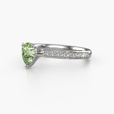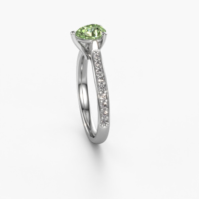 The ring shown above is called the Mignon per 2. We call this type of ring a pavé solitaire ring because it has one centre gemstone and a band that is also pave set with gemstones. The platinum engagement ring is set with a pear 6.5x4.5 mm green lab grown diamond centre stone and the band is pave set with diamond gemstones. Each jewel is made just for you by our master goldsmiths in our own studio.This trendy platinum pavé solitaire engagement ring has an exquisite pear green lab grown diamond centre stone. To further accentuate the centre stone, the band is fully set with more diamonds. Its open prong setting allows light to strike the green lab grown diamond from various angles and this adds sparkle to your green lab grown diamond ring. The photo shown above depicts the goldsmith's carefully handcrafted details of the ring. The high positioning of the centre stone is truly eye-catching. The perfect engagement ring for the crown jewel of your life! Are you on a budget? Please feel free to contact us, so we can go discuss your options. We offer our engagement rings at guaranteed best price, because we make them to order. You won't find such a price anywhere else!Our team adds new designs to our online collection daily. Our designers and goldsmiths work together in creating the best design. We strive to offer a diverse collection of jewels. Perhaps you have a specific jewel design in mind. One you came across somewhere. Please contact us for a free consultation. We will make you an offer, based on a fair price/ quality ratio, that will baffle you.To make it easier for you, we offer a 30 day return policy. Check our terms and conditions.