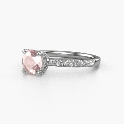 The ring shown above is called the Saskia rnd 1. We call this type of ring a pavé solitaire ring because it has one centre gemstone and a band that is also pave set with gemstones. The platinum engagement ring is set with a round 6.5 mm morganite champagne centre stone and the band is pave set with lab grown diamond gemstones. Each jewel is made with passion and love by one of our master goldsmiths.This exclusive platinum pavé solitaire engagement ring has an exquisite round morganite champagne centre stone. To further accentuate the centre stone, the band is fully set with more lab-grown diamonds. Its open prong setting allows light to strike the morganite champagne from various angles and this adds sparkle to your morganite champagne ring. The photo shown above depicts the goldsmith's carefully handcrafted details of the ring. The high positioning of the centre stone is truly eye-catching. The perfect engagement ring for the crown jewel of your life! By using a combination of the latest modern techniques, combined with ancient crafting, we can make all our engagement rings in our own studio. Each jewel is made to order. This is advantageous because we can offer you a price you won't find anywhere else.Do you have a specific ring in mind? One you came across somewhere. Please feel free to tell us your wishes and we will turn your design into a unique engagement ring. You can follow the development of your ring design because we use 3D drawings. This gives you a realistic preview of your design. We will gladly send you a non-binding offer, based on a fair price/ quality ratio. It will amaze you.To make it easier for you, we offer a 30 day return policy. Check our terms and conditions.