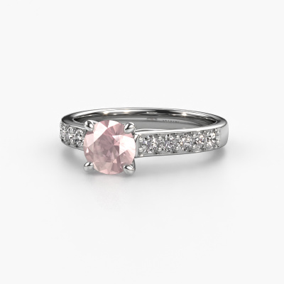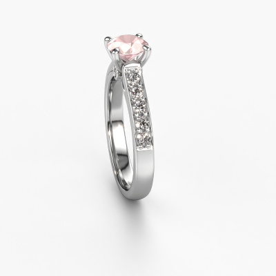 The ring shown above is called the Valorie RND 2. We call this type of ring a pavé solitaire ring because it has one centre gemstone and a band that is also pave set with gemstones. The platinum engagement ring is set with a round 6.5 mm morganite champagne centre stone and the band is pave set with lab grown diamond gemstones. Each jewel is made just for you, with attention to detail and design.This modern platinum pavé solitaire engagement ring has an exquisite round morganite champagne centre stone. To further accentuate the centre stone, the band is fully set with more lab-grown diamonds. Its open prong setting allows light to strike the morganite champagne from various angles and this adds sparkle to your morganite champagne ring. The photo shown above depicts the goldsmith's carefully handcrafted details of the ring. The high positioning of the centre stone is truly eye-catching. The perfect engagement ring for the crown jewel of your life! By using our modern techniques, we can design and customize the finest quality jewels with the utmost care for you. Our engagement rings are always priced 30 percent lower than other jewellers. We make engagement rings to order so we don't have to maintain a large stock. If you have a certain budget, we are more than happy to advice you accordingly.Our designers and goldsmiths work together each day, creating new jewels. Perhaps you have found a nice modern engagement ring somewhere, which can be used to customize your unique ring. Please feel free to contact us. We will make you an offer, based on a fair price/ quality ratio, which will amaze you.To make it easier for you, we offer a 30 day return policy. Check our terms and conditions.