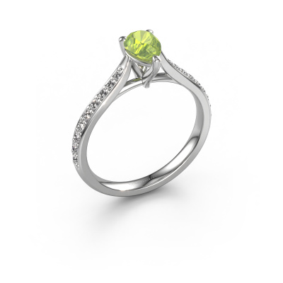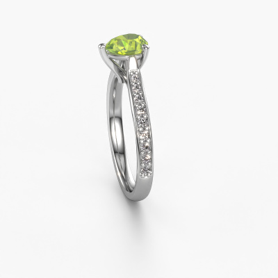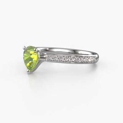 The ring shown above is called the Mignon per 2. We call this type of ring a pavé solitaire ring because it has one centre gemstone and a band that is also pave set with gemstones. The platinum engagement ring is set with a pear 6.5x4.5 mm peridot centre stone and the band is pave set with diamond gemstones. Each jewel is made just for you by our master goldsmiths in our own studio.This trendy platinum pavé solitaire engagement ring has an exquisite pear peridot centre stone. To further accentuate the centre stone, the band is fully set with more diamonds. Its open prong setting allows light to strike the peridot from various angles and this adds sparkle to your peridot ring. The photo shown above depicts the goldsmith's carefully handcrafted details of the ring. The high positioning of the centre stone is truly eye-catching. The perfect engagement ring for the crown jewel of your life! Are you on a budget? Please feel free to contact us, so we can go discuss your options. We offer our engagement rings at guaranteed best price, because we make them to order. You won't find such a price anywhere else!Our team adds new designs to our online collection daily. Our designers and goldsmiths work together in creating the best design. We strive to offer a diverse collection of jewels. Perhaps you have a specific jewel design in mind. One you came across somewhere. Please contact us for a free consultation. We will make you an offer, based on a fair price/ quality ratio, that will baffle you.To make it easier for you, we offer a 30 day return policy. Check our terms and conditions.