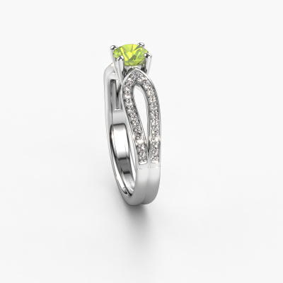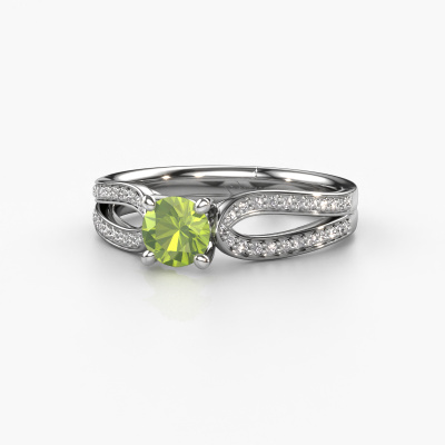 The ring shown above is called the Antonia rnd 2. We call this type of ring a pavé solitaire ring because it has one centre gemstone and a band that is also pave set with gemstones. The platinum engagement ring is set with a round 5 mm peridot centre stone and the band is pave set with diamond gemstones. Each jewel is made just for you, with attention to detail and design.This traditional platinum pavé solitaire engagement ring has an exquisite round peridot centre stone. To further accentuate the centre stone, the band is fully set with more diamonds. Its open prong setting allows light to strike the peridot from various angles and this adds sparkle to your peridot ring. The photo shown above depicts the goldsmith's carefully handcrafted details of the ring. The high positioning of the centre stone is truly eye-catching. The perfect engagement ring for the crown jewel of your life! After receiving your order, our goldsmiths will start the creative process of making your Antonia rnd 2 engagement ring. We don't keep stock. This is advantageous because these costs will not be passed on to you. Therefore, we can offer jewellery at exceptionally low prices.Have you found a specific engagement ring somewhere which you would like to give to your loved one? Please feel free to express your wishes to our jewel designers because we would be honoured to turn your design into a traditional engagement ring. You can follow the development of your ring design because we use 3D drawings. This gives you a realistic preview of how your design will look. You can also preorder a dummy. A dummy is a plastic ring, which can be shaped according your ring design. You can try it on and check if its width and size are suitable for you. We will gladly send you a non-binding offer, based on a fair price/ quality ratio. It will amaze you, considering the quality of the ring and gemstones.To make it easier for you, we offer a 30 day return policy. Check our terms and conditions.