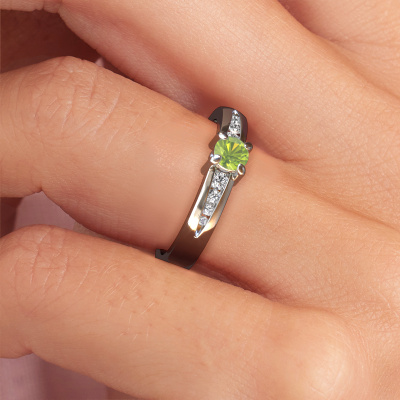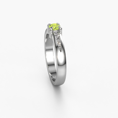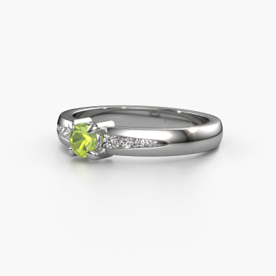 The ring shown above is called the Zohra. We call this type of ring a pavé solitaire ring because it has one centre gemstone and a band that is also pave set with gemstones. The platinum engagement ring is set with a round 4 mm peridot centre stone and the band is pave set with diamond gemstones. Each jewel is made just for you by our master goldsmiths in our own studio.This modern platinum pavé solitaire engagement ring has an exquisite round peridot centre stone. To further accentuate the centre stone, the band is fully set with more diamonds. Its open prong setting allows light to strike the peridot from various angles and this adds sparkle to your peridot ring. The photo shown above depicts the goldsmith's carefully handcrafted details of the ring. The high positioning of the centre stone is truly eye-catching. The perfect engagement ring for the crown jewel of your life! Because we design and deliver our own rings, we can offer you a engagement ring at a price you won't find anywhere else. A ring is made to order, which helps prevent excess supplies, so we can make you a great price offer. We understand it feels risky, buying your engagement ring online, but we will gladly assist in the designing process, taking your budget into consideration.Our team adds new designs to our online collection daily. Our designers and goldsmiths work together in creating the best design. We strive to offer a diverse collection of jewels. Perhaps you have a specific jewel design in mind. One you came across somewhere. Please contact us for a free consultation. We will make you an offer, based on a fair price/ quality ratio, that will baffle you.To make it easier for you, we offer a 30 day return policy. Check our terms and conditions.