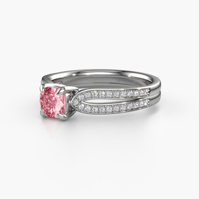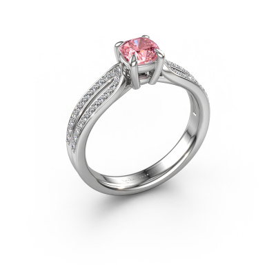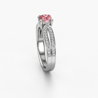The ring shown above is called the Antonia cus 2. We call this type of ring a pavé solitaire ring because it has one centre gemstone and a band that is also pave set with gemstones. The platinum engagement ring is set with a cushion 5 mm pink lab grown diamond centre stone and the band is pave set with lab grown diamond gemstones. Each jewel is made just for you by our master goldsmiths in our own studio.This fantasy platinum pavé solitaire engagement ring has an exquisite cushion pink lab grown diamond centre stone. To further accentuate the centre stone, the band is fully set with more lab-grown diamonds. Its open prong setting allows light to strike the pink lab grown diamond from various angles and this adds sparkle to your pink lab grown diamond ring. The photo shown above depicts the goldsmith's carefully handcrafted details of the ring. The high positioning of the centre stone is truly eye-catching. The perfect engagement ring for the crown jewel of your life! By using our modern techniques, we can design and customize the finest quality jewels with the utmost care for you. Our engagement rings are always priced 30 percent lower than other jewellers. We make engagement rings to order so we don't have to maintain a large stock. If you have a certain budget, we are more than happy to advice you accordingly.Have you found a specific engagement ring somewhere which you would like to give to your loved one? Please feel free to express your wishes to our jewel designers because we would be honoured to turn your design into a fantasy engagement ring. You can follow the development of your ring design because we use 3D drawings. This gives you a realistic preview of how your design will look. You can also preorder a dummy. A dummy is a plastic ring, which can be shaped according your ring design. You can try it on and check if its width and size are suitable for you. We will gladly send you a non-binding offer, based on a fair price/ quality ratio. It will amaze you, considering the quality of the ring and gemstones.To make it easier for you, we offer a 30 day return policy. Check our terms and conditions.