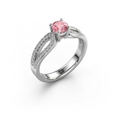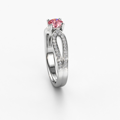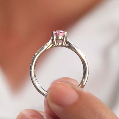 The ring shown above is called the Antonia rnd 2. We call this type of ring a pavé solitaire ring because it has one centre gemstone and a band that is also pave set with gemstones. The platinum engagement ring is set with a round 5 mm pink lab grown diamond centre stone and the band is pave set with diamond gemstones. Each jewel is made just for you, with attention to detail and design.This traditional platinum pavé solitaire engagement ring has an exquisite round pink lab grown diamond centre stone. To further accentuate the centre stone, the band is fully set with more diamonds. Its open prong setting allows light to strike the pink lab grown diamond from various angles and this adds sparkle to your pink lab grown diamond ring. The photo shown above depicts the goldsmith's carefully handcrafted details of the ring. The high positioning of the centre stone is truly eye-catching. The perfect engagement ring for the crown jewel of your life! After receiving your order, our goldsmiths will start the creative process of making your Antonia rnd 2 engagement ring. We don't keep stock. This is advantageous because these costs will not be passed on to you. Therefore, we can offer jewellery at exceptionally low prices.Have you found a specific engagement ring somewhere which you would like to give to your loved one? Please feel free to express your wishes to our jewel designers because we would be honoured to turn your design into a traditional engagement ring. You can follow the development of your ring design because we use 3D drawings. This gives you a realistic preview of how your design will look. You can also preorder a dummy. A dummy is a plastic ring, which can be shaped according your ring design. You can try it on and check if its width and size are suitable for you. We will gladly send you a non-binding offer, based on a fair price/ quality ratio. It will amaze you, considering the quality of the ring and gemstones.To make it easier for you, we offer a 30 day return policy. Check our terms and conditions.