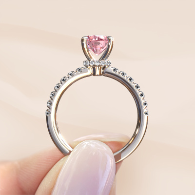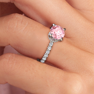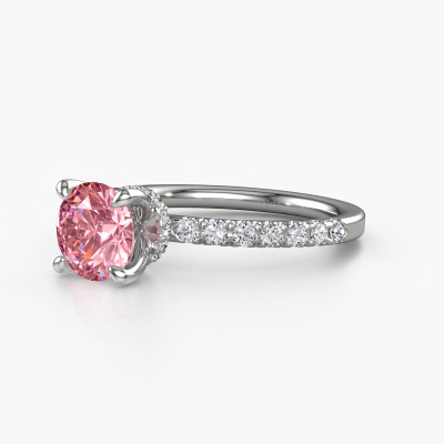 The ring shown above is called the Crystal rnd 4. We call this type of ring a pavé solitaire ring because it has one centre gemstone and a band that is also pave set with gemstones. The platinum engagement ring is set with a round 7 mm pink lab grown diamond centre stone and the band is pave set with lab grown diamond gemstones. Each jewel is made to shine bright around your finger. Each jewel is hand made with love by our goldsmiths.This fantasy platinum pavé solitaire engagement ring has an exquisite round pink lab grown diamond centre stone. To further accentuate the centre stone, the band is fully set with more lab-grown diamonds. Its open prong setting allows light to strike the pink lab grown diamond from various angles and this adds sparkle to your pink lab grown diamond ring. The photo shown above depicts the goldsmith's carefully handcrafted details of the ring. The high positioning of the centre stone is truly eye-catching. The perfect engagement ring for the crown jewel of your life! By using our modern techniques, we can design and customize the finest quality jewels with the utmost care for you. Our engagement rings are always priced 30 percent lower than other jewellers. We make engagement rings to order so we don't have to maintain a large stock. If you have a certain budget, we are more than happy to advice you accordingly.Have you found a specific engagement ring somewhere which you would like to give to your loved one? Please feel free to express your wishes to our jewel designers because we would be honoured to turn your design into a fantasy engagement ring. You can follow the development of your ring design because we use 3D drawings. This gives you a realistic preview of how your design will look. You can also preorder a dummy. A dummy is a plastic ring, which can be shaped according your ring design. You can try it on and check if its width and size are suitable for you. We will gladly send you a non-binding offer, based on a fair price/ quality ratio. It will amaze you, considering the quality of the ring and gemstones.To make it easier for you, we offer a 30 day return policy. Check our terms and conditions.