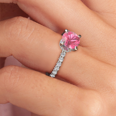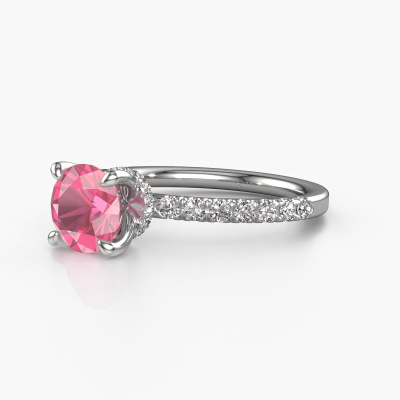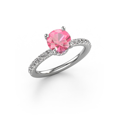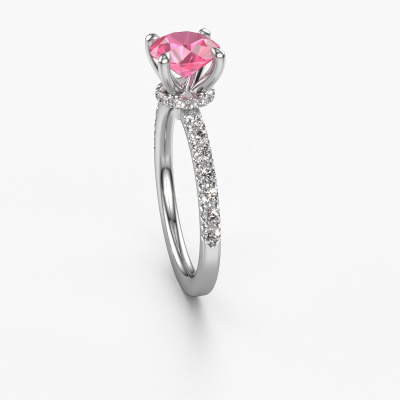The ring shown above is called the Crystal rnd 4. We call this type of ring a pavé solitaire ring because it has one centre gemstone and a band that is also pave set with gemstones. The platinum engagement ring is set with a round 7 mm pink sapphire centre stone and the band is pave set with lab grown diamond gemstones. Each jewel is made to shine bright around your finger. Each jewel is hand made with love by our goldsmiths.This fantasy platinum pavé solitaire engagement ring has an exquisite round pink sapphire centre stone. To further accentuate the centre stone, the band is fully set with more lab-grown diamonds. Its open prong setting allows light to strike the pink sapphire from various angles and this adds sparkle to your pink sapphire ring. The photo shown above depicts the goldsmith's carefully handcrafted details of the ring. The high positioning of the centre stone is truly eye-catching. The perfect engagement ring for the crown jewel of your life! By using our modern techniques, we can design and customize the finest quality jewels with the utmost care for you. Our engagement rings are always priced 30 percent lower than other jewellers. We make engagement rings to order so we don't have to maintain a large stock. If you have a certain budget, we are more than happy to advice you accordingly.Have you found a specific engagement ring somewhere which you would like to give to your loved one? Please feel free to express your wishes to our jewel designers because we would be honoured to turn your design into a fantasy engagement ring. You can follow the development of your ring design because we use 3D drawings. This gives you a realistic preview of how your design will look. You can also preorder a dummy. A dummy is a plastic ring, which can be shaped according your ring design. You can try it on and check if its width and size are suitable for you. We will gladly send you a non-binding offer, based on a fair price/ quality ratio. It will amaze you, considering the quality of the ring and gemstones.To make it easier for you, we offer a 30 day return policy. Check our terms and conditions.