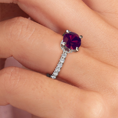 The ring shown above is called the Crystal rnd 4. We call this type of ring a pavé solitaire ring because it has one centre gemstone and a band that is also pave set with gemstones. The platinum engagement ring is set with a round 7 mm rhodolite centre stone and the band is pave set with lab grown diamond gemstones. Each jewel is made to shine bright around your finger. Each jewel is hand made with love by our goldsmiths.This fantasy platinum pavé solitaire engagement ring has an exquisite round rhodolite centre stone. To further accentuate the centre stone, the band is fully set with more lab-grown diamonds. Its open prong setting allows light to strike the rhodolite from various angles and this adds sparkle to your rhodolite ring. The photo shown above depicts the goldsmith's carefully handcrafted details of the ring. The high positioning of the centre stone is truly eye-catching. The perfect engagement ring for the crown jewel of your life! By using our modern techniques, we can design and customize the finest quality jewels with the utmost care for you. Our engagement rings are always priced 30 percent lower than other jewellers. We make engagement rings to order so we don't have to maintain a large stock. If you have a certain budget, we are more than happy to advice you accordingly.Have you found a specific engagement ring somewhere which you would like to give to your loved one? Please feel free to express your wishes to our jewel designers because we would be honoured to turn your design into a fantasy engagement ring. You can follow the development of your ring design because we use 3D drawings. This gives you a realistic preview of how your design will look. You can also preorder a dummy. A dummy is a plastic ring, which can be shaped according your ring design. You can try it on and check if its width and size are suitable for you. We will gladly send you a non-binding offer, based on a fair price/ quality ratio. It will amaze you, considering the quality of the ring and gemstones.To make it easier for you, we offer a 30 day return policy. Check our terms and conditions.