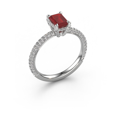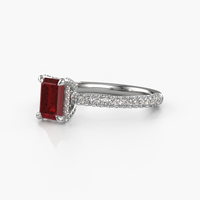The ring shown above is called the Saskia eme 2. We call this type of ring a pavé solitaire ring because it has one centre gemstone and a band that is also pave set with gemstones. The platinum engagement ring is set with a emerald cut 6.5x4.5 mm ruby centre stone and the band is pave set with diamond gemstones. Each jewel is made by a team of passionate goldsmiths and jewel designers. This will make your crown jewel truly eye-catching.This exclusive platinum pavé solitaire engagement ring has an exquisite emerald cut ruby centre stone. To further accentuate the centre stone, the band is fully set with more diamonds. Its open prong setting allows light to strike the ruby from various angles and this adds sparkle to your ruby ring. The photo shown above depicts the goldsmith's carefully handcrafted details of the ring. The high positioning of the centre stone is truly eye-catching. The perfect engagement ring for the crown jewel of your life! By using our modern techniques, we can design and customize the finest quality jewels with the utmost care for you. Our engagement rings are always priced 30 percent lower than other jewellers. We make engagement rings to order so we don't have to maintain a large stock. If you have a certain budget, we are more than happy to advice you accordingly.Different styles of new rings are made daily by our team. Perhaps you have found a pavé solitaire engagement ring somewhere. One you would like to give to your loved one. Please feel free to share your thoughts and design with our jewel designers. We would love to turn your design into a exclusive engagement ring. You can follow the development of your ring design because we use very detailed 3D drawings. On top of that, you can order a dummy of the design. A dummy is a plastic ring, which can be shaped according your ring design. You can try it on and check if the engagement ring is up to standard. We will gladly send you a non-binding offer, based on a fair price/ quality ratio. The offer will baffle you, considering the quality of the ring and gemstones.To make it easier for you, we offer a 30 day return policy. Check our terms and conditions.
