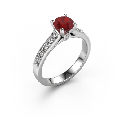 The ring shown above is called the Valorie RND 2. We call this type of ring a pavé solitaire ring because it has one centre gemstone and a band that is also pave set with gemstones. The platinum engagement ring is set with a round 6.5 mm ruby centre stone and the band is pave set with lab grown diamond gemstones. Each jewel is made just for you, with attention to detail and design.This modern platinum pavé solitaire engagement ring has an exquisite round ruby centre stone. To further accentuate the centre stone, the band is fully set with more lab-grown diamonds. Its open prong setting allows light to strike the ruby from various angles and this adds sparkle to your ruby ring. The photo shown above depicts the goldsmith's carefully handcrafted details of the ring. The high positioning of the centre stone is truly eye-catching. The perfect engagement ring for the crown jewel of your life! By using our modern techniques, we can design and customize the finest quality jewels with the utmost care for you. Our engagement rings are always priced 30 percent lower than other jewellers. We make engagement rings to order so we don't have to maintain a large stock. If you have a certain budget, we are more than happy to advice you accordingly.Our designers and goldsmiths work together each day, creating new jewels. Perhaps you have found a nice modern engagement ring somewhere, which can be used to customize your unique ring. Please feel free to contact us. We will make you an offer, based on a fair price/ quality ratio, which will amaze you.To make it easier for you, we offer a 30 day return policy. Check our terms and conditions.