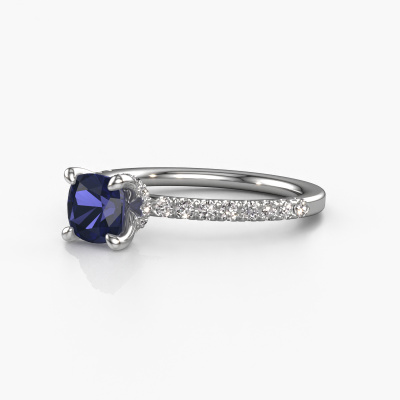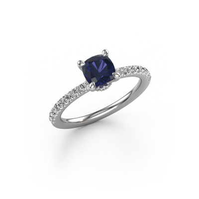 The ring shown above is called the Crystal CUS 4. We call this type of ring a pavé solitaire ring because it has one centre gemstone and a band that is also pave set with gemstones. The platinum engagement ring is set with a cushion 5.5 mm sapphire centre stone and the band is pave set with diamond gemstones. Each jewel is created to add sparkle to your finger, each jewel is lovingly made by hand by our goldsmiths.This chic platinum pavé solitaire engagement ring has an exquisite cushion sapphire centre stone. To further accentuate the centre stone, the band is fully set with more diamonds. Its open prong setting allows light to strike the sapphire from various angles and this adds sparkle to your sapphire ring. The photo shown above depicts the goldsmith's carefully handcrafted details of the ring. The high positioning of the centre stone is truly eye-catching. The perfect engagement ring for the crown jewel of your life! By using our modern techniques, we can design and customize the finest quality jewels with the utmost care for you. Our engagement rings are always priced 30 percent lower than other jewellers. We make engagement rings to order so we don't have to maintain a large stock. If you have a certain budget, we are more than happy to advice you accordingly.Do you have a specific ring in mind? One you came across somewhere. Please feel free to tell us your wishes and we will turn your design into a unique engagement ring. You can follow the development of your ring design because we use 3D drawings. This gives you a realistic preview of your design. We will gladly send you a non-binding offer, based on a fair price/ quality ratio. It will amaze you.To make it easier for you, we offer a 30 day return policy. Check our terms and conditions.
