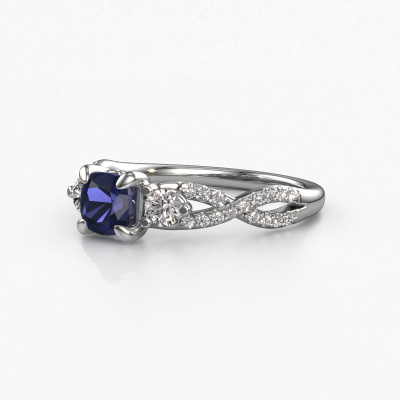 The ring shown above is called the Marilou CUS. We call this type of ring a 3-stone ring because it has one centre gemstone and a band that is also pave set with gemstones. The platinum engagement ring is set with a cushion 5 mm sapphire centre stone and the band is pave set with diamond gemstones. Each jewel is unique in every way! Simply customize to your liking,This traditional platinum 3-stone engagement ring has an exquisite cushion sapphire centre stone. To further accentuate the centre stone, the band is fully set with more diamonds. Its open prong setting allows light to strike the sapphire from various angles and this adds sparkle to your sapphire ring. The photo shown above depicts the goldsmith's carefully handcrafted details of the ring. The high positioning of the centre stone is truly eye-catching. The perfect engagement ring for the crown jewel of your life! By using a combination of the latest modern techniques, combined with ancient crafting, we can make all our engagement rings in our own studio. Each jewel is made to order. This is advantageous because we can offer you a price you won't find anywhere else.Our team adds new designs to our online collection daily. Our designers and goldsmiths work together in creating the best design. We strive to offer a diverse collection of jewels. Perhaps you have a specific jewel design in mind. One you came across somewhere. Please contact us for a free consultation. We will make you an offer, based on a fair price/ quality ratio, that will baffle you.To make it easier for you, we offer a 30 day return policy. Check our terms and conditions.