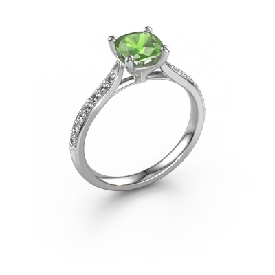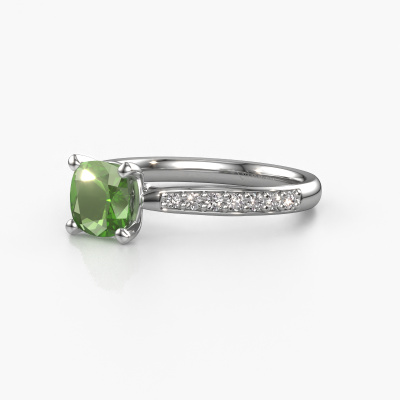 The ring shown above is called the Mignon cus 2. We call this type of ring a pavé solitaire ring because it has one centre gemstone and a band that is also pave set with gemstones. The platinum engagement ring is set with a cushion 6 mm tourmaline green centre stone and the band is pave set with lab grown diamond gemstones. Each jewel is made with passion and love by one of our master goldsmiths.This exclusive platinum pavé solitaire engagement ring has an exquisite cushion tourmaline green centre stone. To further accentuate the centre stone, the band is fully set with more lab-grown diamonds. Its open prong setting allows light to strike the tourmaline green from various angles and this adds sparkle to your tourmaline green ring. The photo shown above depicts the goldsmith's carefully handcrafted details of the ring. The high positioning of the centre stone is truly eye-catching. The perfect engagement ring for the crown jewel of your life! After receiving your order, our goldsmiths will start the creative process of making your Mignon cus 2 engagement ring. We don't keep stock. This is advantageous because these costs will not be passed on to you. Therefore, we can offer jewellery at exceptionally low prices.Our team adds new designs to our online collection daily. Our designers and goldsmiths work together in creating the best design. We strive to offer a diverse collection of jewels. Perhaps you have a specific jewel design in mind. One you came across somewhere. Please contact us for a free consultation. We will make you an offer, based on a fair price/ quality ratio, that will baffle you.To make it easier for you, we offer a 30 day return policy. Check our terms and conditions.