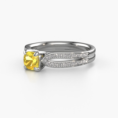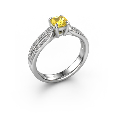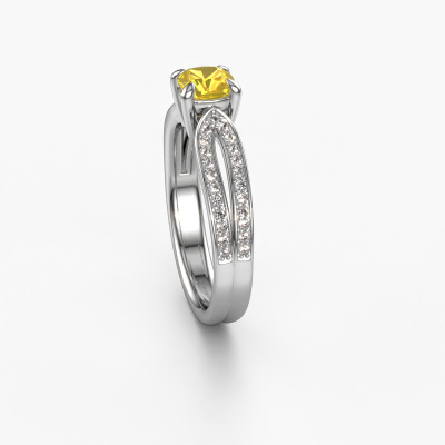 The ring shown above is called the Antonia cus 2. We call this type of ring a pavé solitaire ring because it has one centre gemstone and a band that is also pave set with gemstones. The platinum engagement ring is set with a cushion 5 mm yellow sapphire centre stone and the band is pave set with lab grown diamond gemstones. Each jewel is made just for you by our master goldsmiths in our own studio.This fantasy platinum pavé solitaire engagement ring has an exquisite cushion yellow sapphire centre stone. To further accentuate the centre stone, the band is fully set with more lab-grown diamonds. Its open prong setting allows light to strike the yellow sapphire from various angles and this adds sparkle to your yellow sapphire ring. The photo shown above depicts the goldsmith's carefully handcrafted details of the ring. The high positioning of the centre stone is truly eye-catching. The perfect engagement ring for the crown jewel of your life! By using our modern techniques, we can design and customize the finest quality jewels with the utmost care for you. Our engagement rings are always priced 30 percent lower than other jewellers. We make engagement rings to order so we don't have to maintain a large stock. If you have a certain budget, we are more than happy to advice you accordingly.Have you found a specific engagement ring somewhere which you would like to give to your loved one? Please feel free to express your wishes to our jewel designers because we would be honoured to turn your design into a fantasy engagement ring. You can follow the development of your ring design because we use 3D drawings. This gives you a realistic preview of how your design will look. You can also preorder a dummy. A dummy is a plastic ring, which can be shaped according your ring design. You can try it on and check if its width and size are suitable for you. We will gladly send you a non-binding offer, based on a fair price/ quality ratio. It will amaze you, considering the quality of the ring and gemstones.To make it easier for you, we offer a 30 day return policy. Check our terms and conditions.